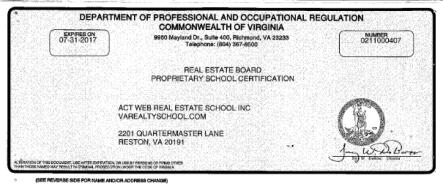 Act Web Real Estate School, doing business as VaRealtySchool.com is approved by DPOR and the Virginia Real Estate